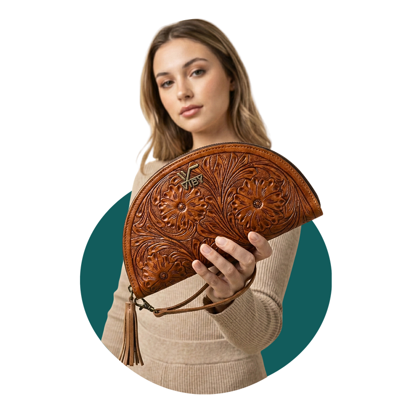 This handcrafted tan brown leather wristlet clutch is a celebration of traditional artistry and modern elegance. Made from premium genuine leather, the surface features intricate floral hand-tooled detailing that gives every piece a unique, artisanal character.
