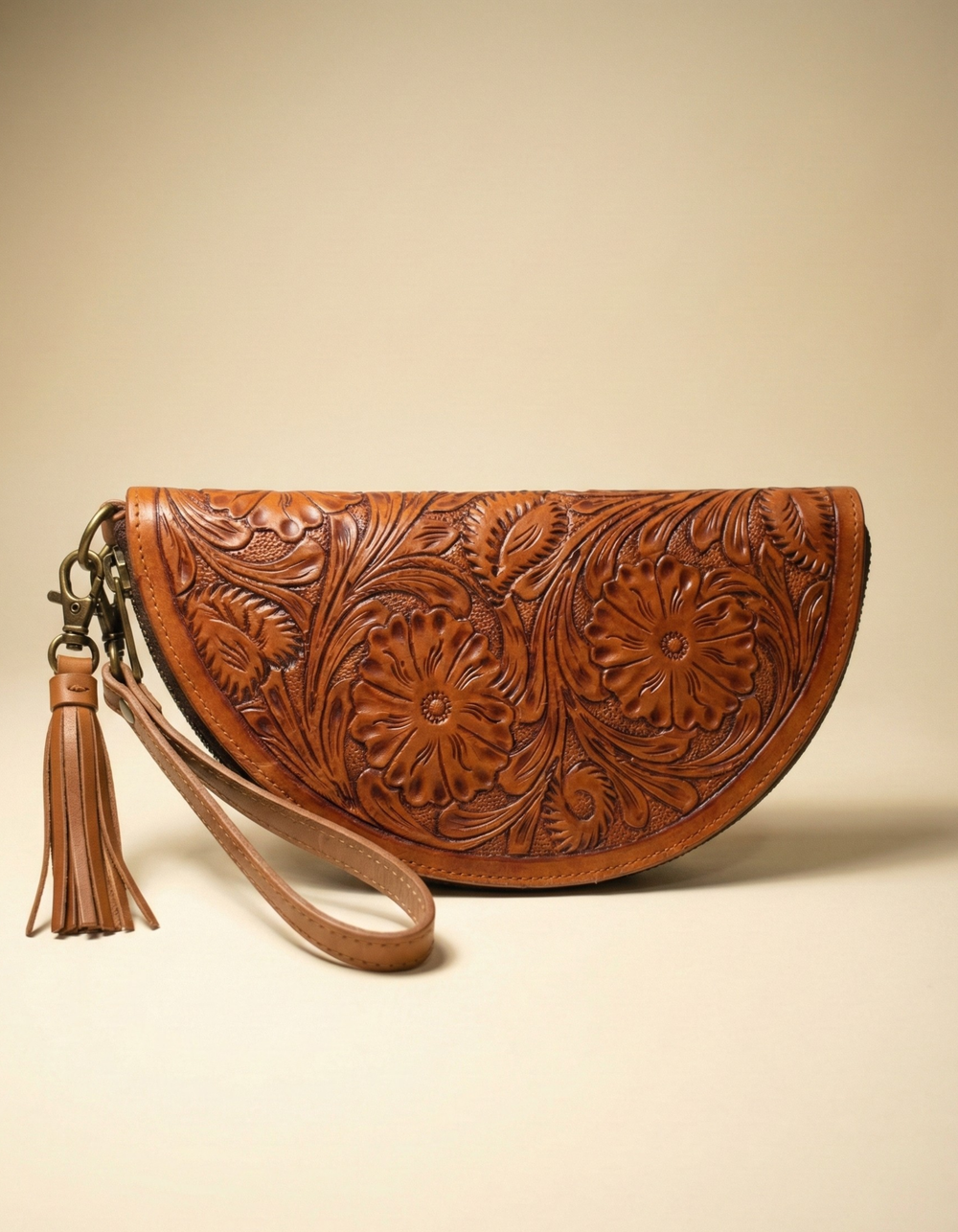 This handcrafted tan brown leather wristlet clutch is a celebration of traditional artistry and modern elegance. Made from premium genuine leather, the surface features intricate floral hand-tooled detailing that gives every piece a unique, artisanal character.