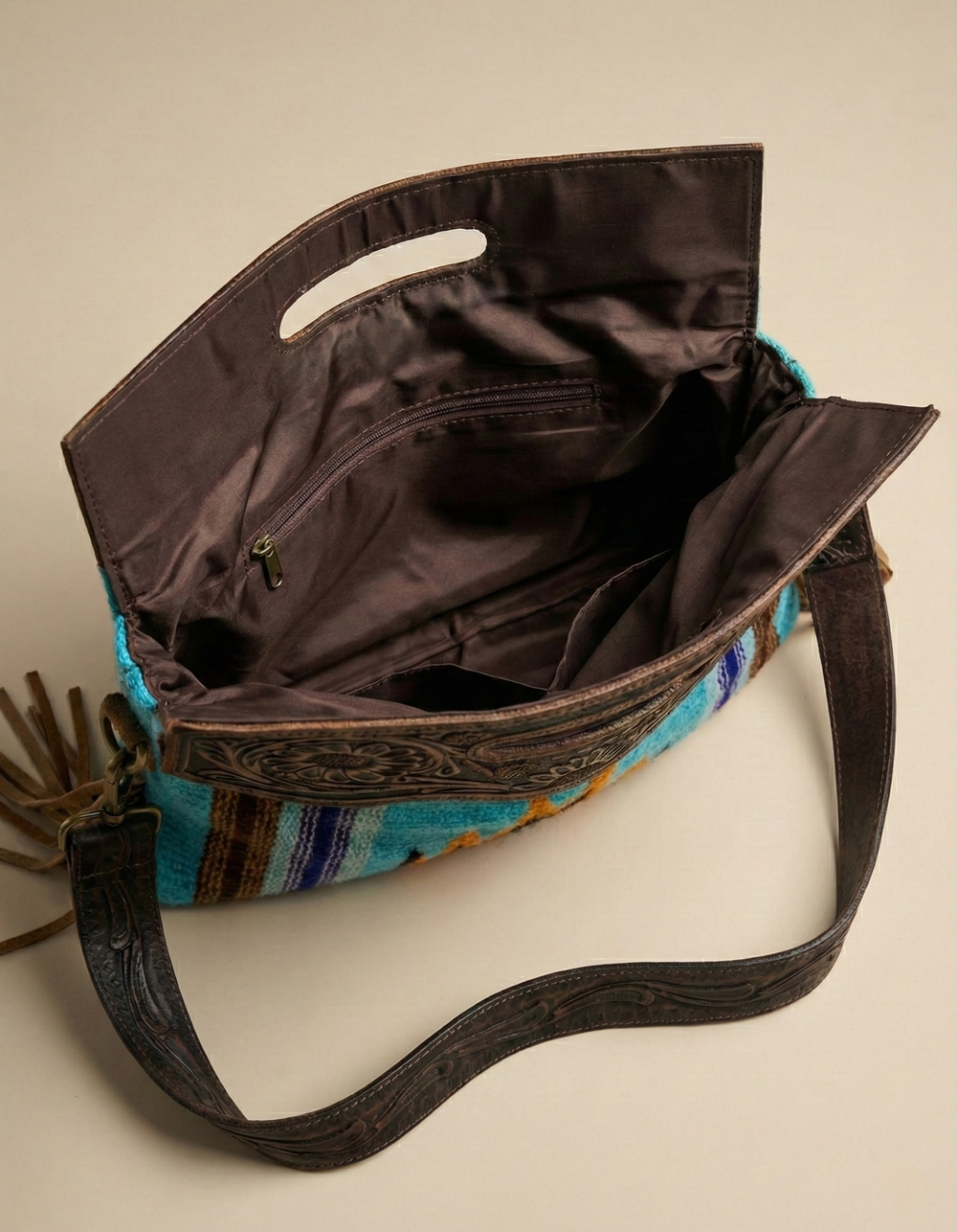 Make a bold style statement with this women’s turquoise tribal pattern leather fringe tote bag, designed for free-spirited, confident women. Crafted with a vibrant woven fabric body featuring striking tribal motifs, this bag is beautifully complemented by a hand-tooled leather flap with intricate floral carving.