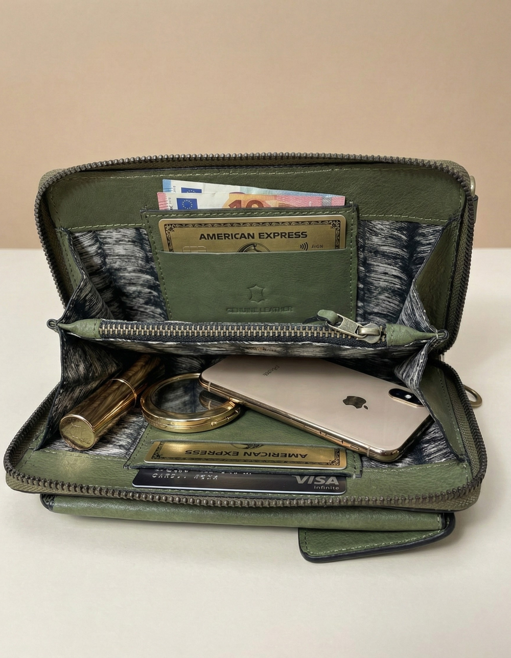 Elevate your everyday style with this women’s olive green studded leather zip wallet wristlet, crafted from high-quality genuine leather with a soft natural grain finish. The elegant olive green shade paired with antique metal stud detailing adds a bold yet sophisticated character to the design.